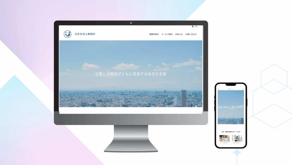 架空の社労士事務所のホームページです。 WordPressのテーマデザインをカスタマイズして構築しています。